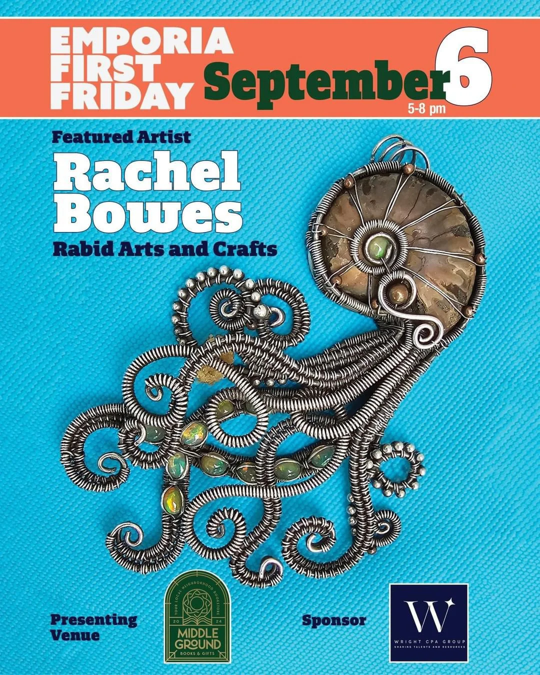 September’s Featured Artist will be Rachel Bowes of Rabid Arts and Crafts. Rachel’s incredibly detailed, wearable art is made with care, love, and positive energy. You can see her art showcased here at Middle Ground Books!